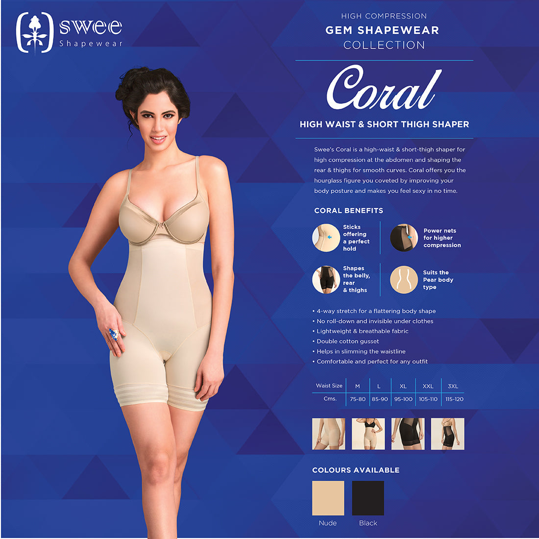 Swee’s Coral is a high-waist & short-thigh shaper for high compression at the abdomen and shaping the rear & thighs for smooth curves. Coral offers you the hourglass figure you coveted by improving your body posture and makes you feel sexy in no time.